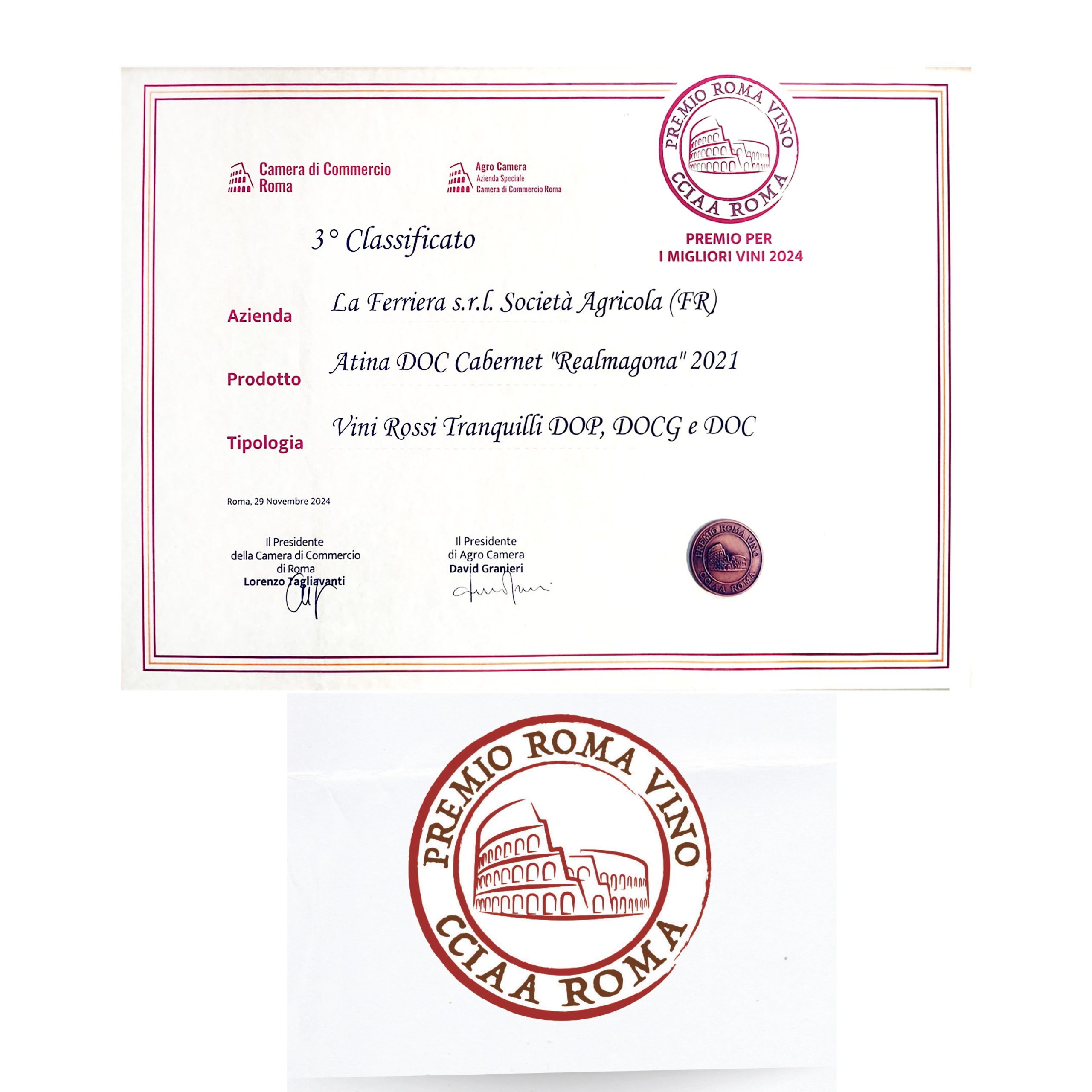 3° classificato al “Premio Roma Vino – I Migliori Vini 2024” con Atina DOC Cabernet “Realmagona” 2021,