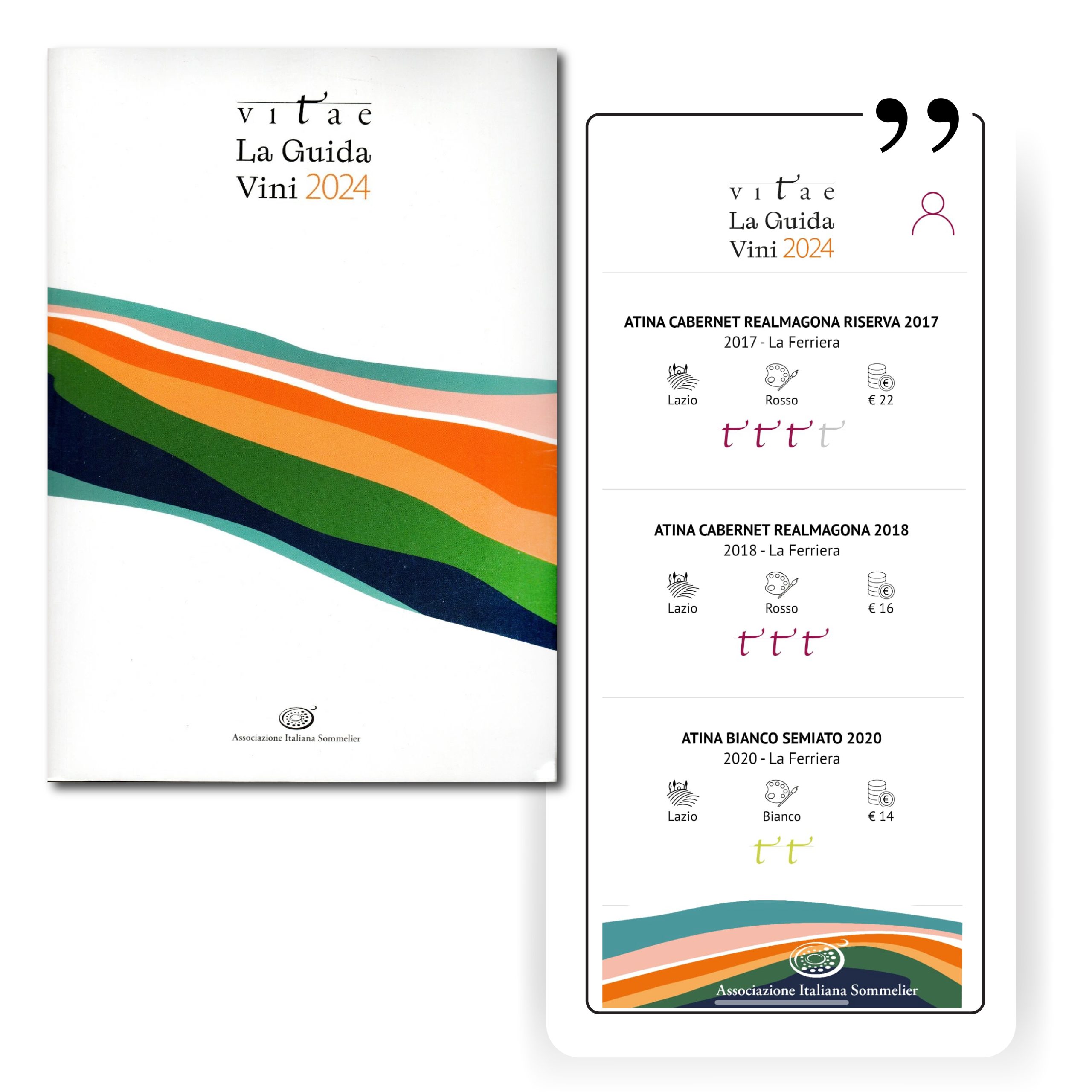 Selezionati su VITAE – La Guida Vini 2024 (AIS) con 3 etichette premiate: Atina Cabernet Realmagona Riserva 2017, Atina Cabernet Realmagona 2018 e Atina Bianco “Semiato” 2020.