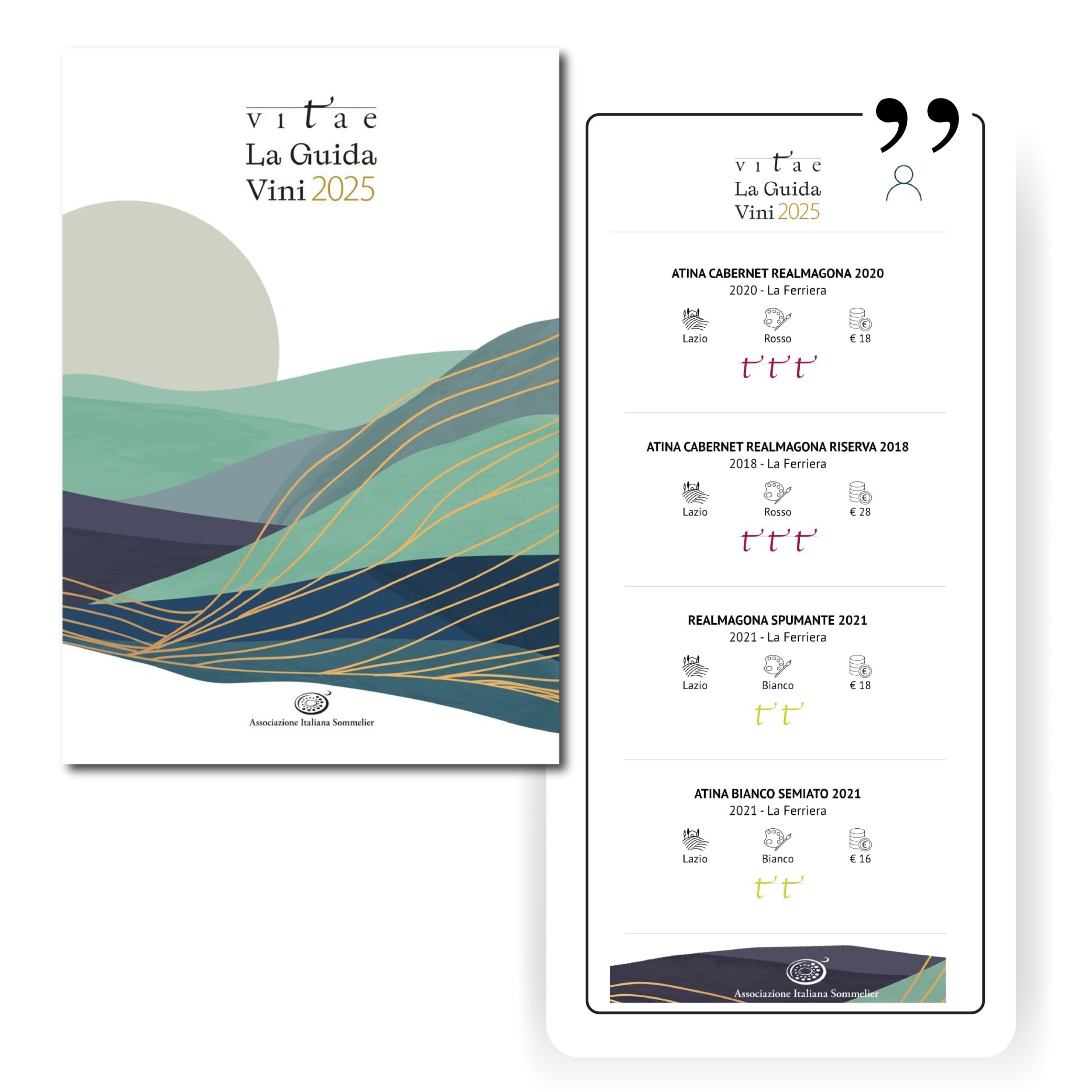 Selezionati su VITAE – La Guida Vini 2025 (AIS) con 4 etichette premiate: Atina Cabernet Realmagona 2020, Atina Cabernet Realmagona Riserva 2018, Realmagona Spumante 2021 e Atina Bianco “Semiato” 2021.